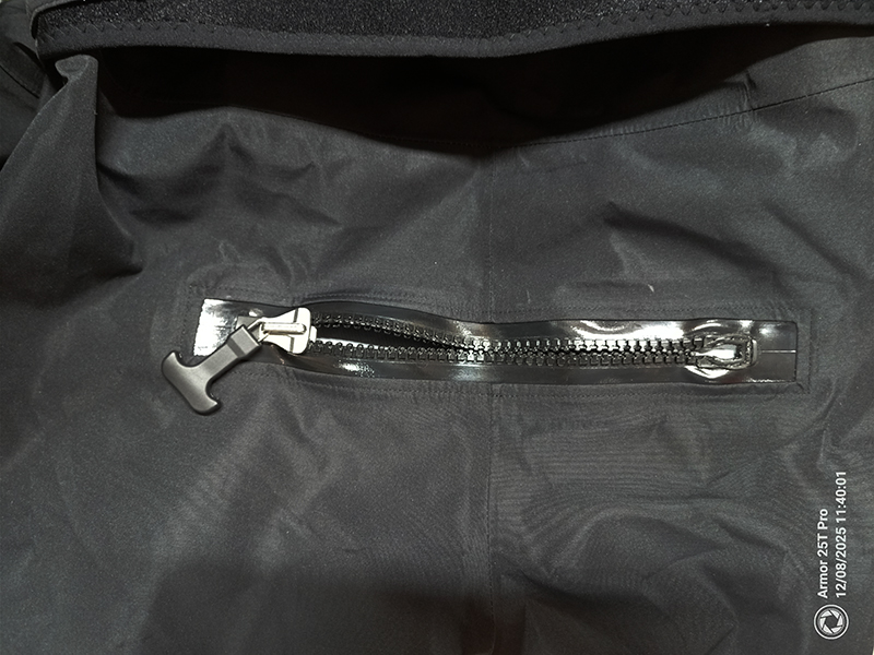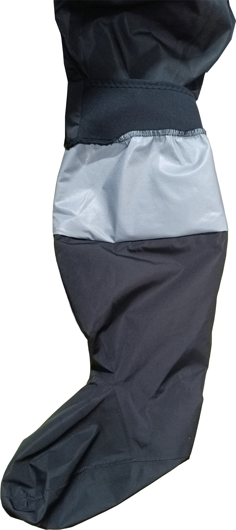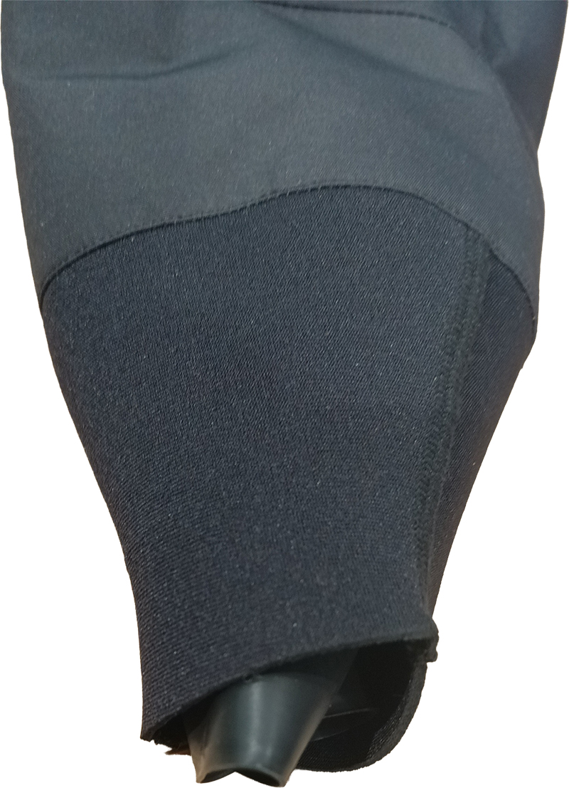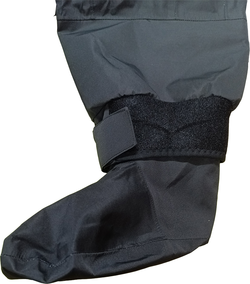 本体は透湿防水生地を使用。首は外側にネオプレン・内側にラテックスガスケット、手首は外側にネオプレン・内側にラテックスガスケットを使用。足首は透湿防水生地を使用。 首部、手首にはラテックスを使用しているので、ご自分のサイズに合わせてカットしてご着用ください。 ダブルウエストで、ベルクロでさらにしっかり締められます。
